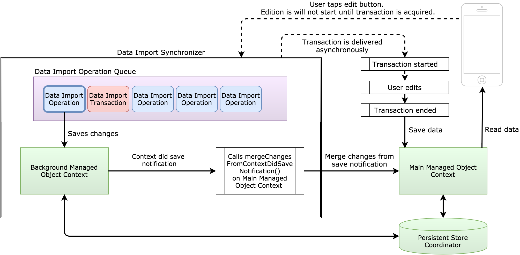 Managed objets altered by a user should appear in Main MOC and persistent store. With Data Import Operations executing in the background mergeChanges(fromContextDidSave:) can be called at any moment, which can result in conflicts. This problem can be avoided for example by pausing Data Import Operation Queue for the time user is performing edits, and this is an approach we are going to focus on.